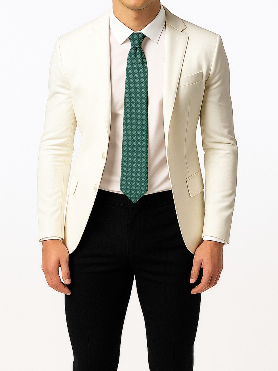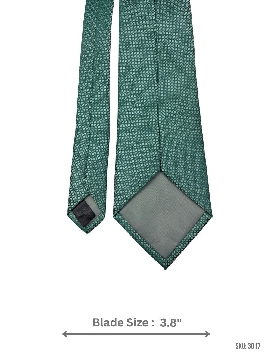 This teal green tie features an all-over silver micro pattern that forms a neat diamond/chain-style repeat, adding detail while staying elegant. A great choice for weddings and smart formal outfits, it pairs best with solid shirts and suits in navy, charcoal, or brown.