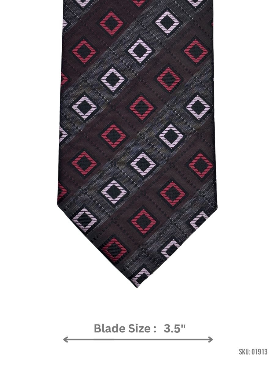 Burgundy geometric-patterned tie with a 3.5-inch blade. A refined choice for formal occasions.