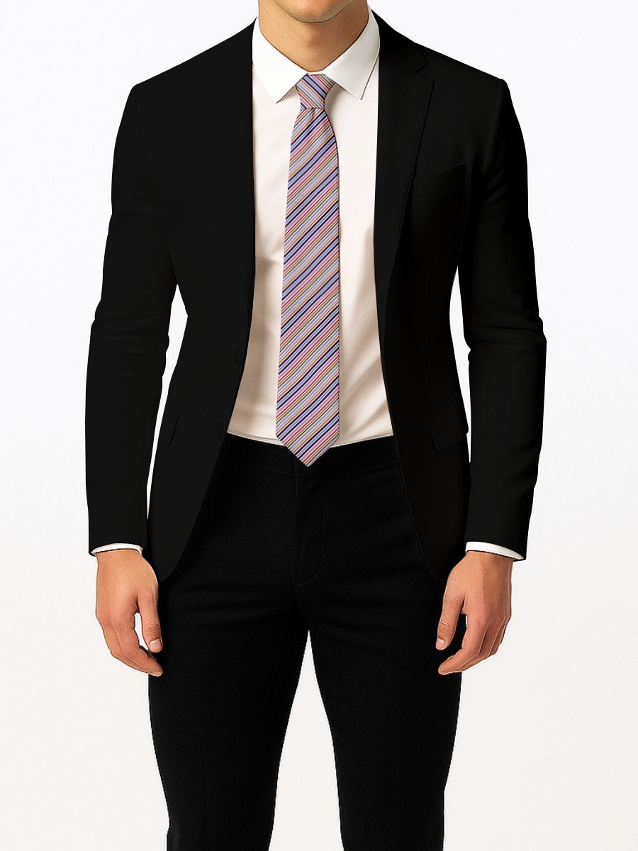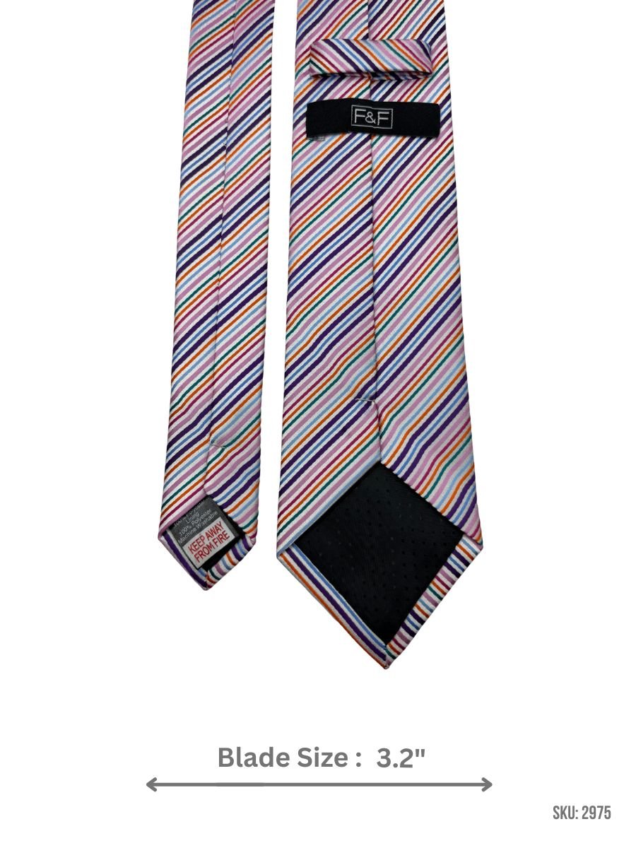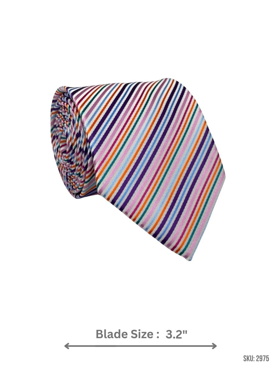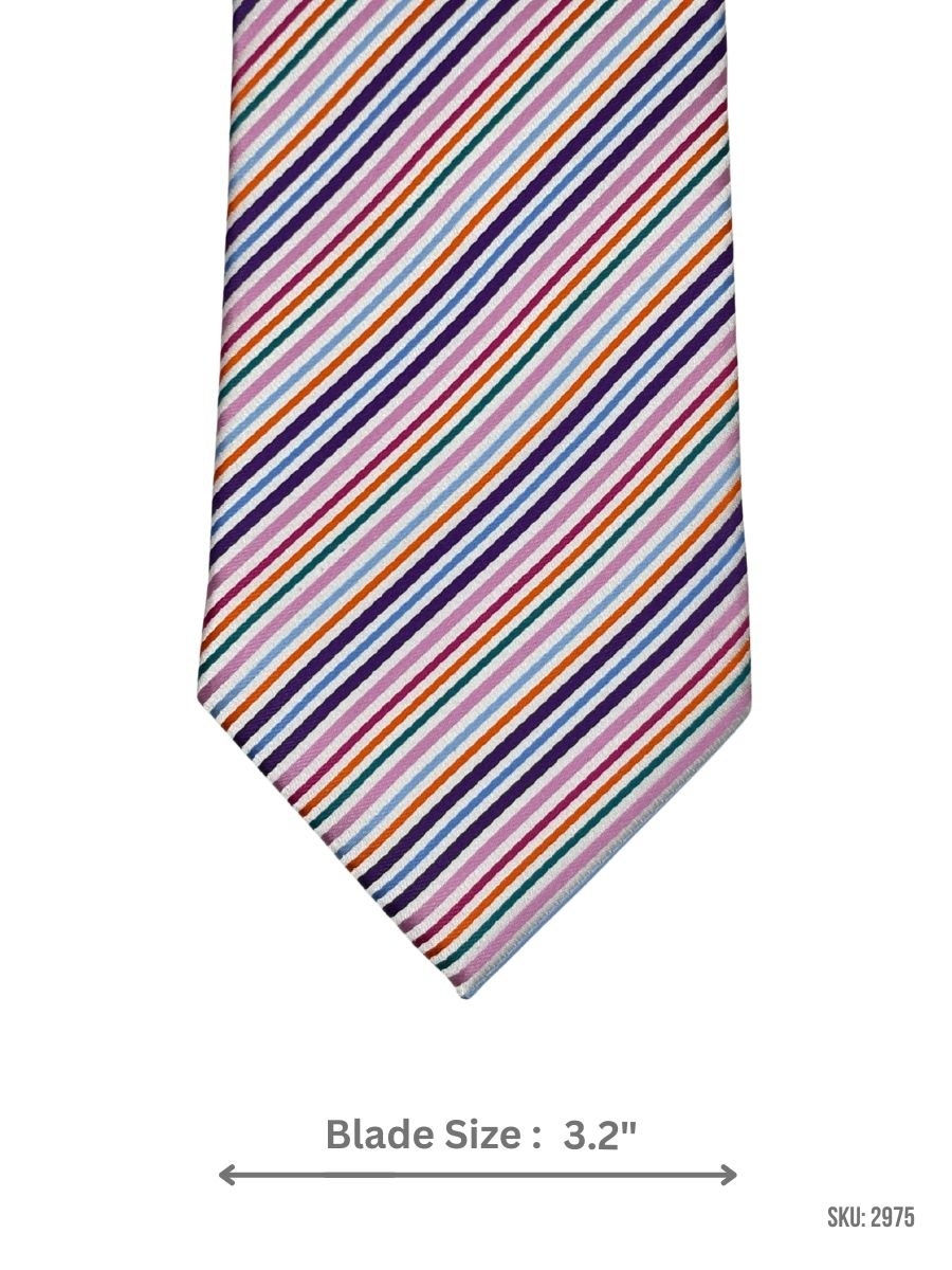 This white striped tie combines crisp diagonal lines in purple, pink, orange, teal, and blue for a lively yet dressy look. Perfect for weddings, parties, and statement styling, it pairs best with solid shirts to keep the outfit clean and balanced.