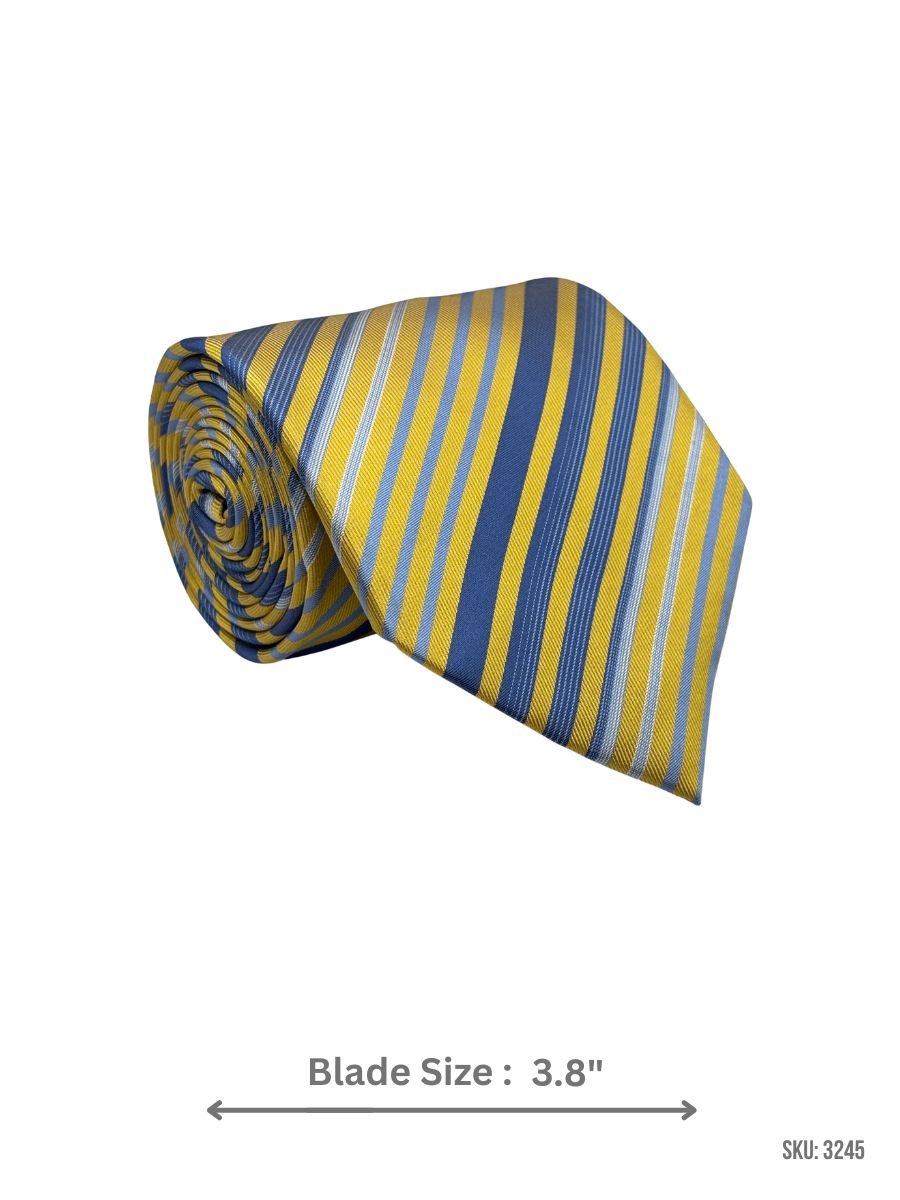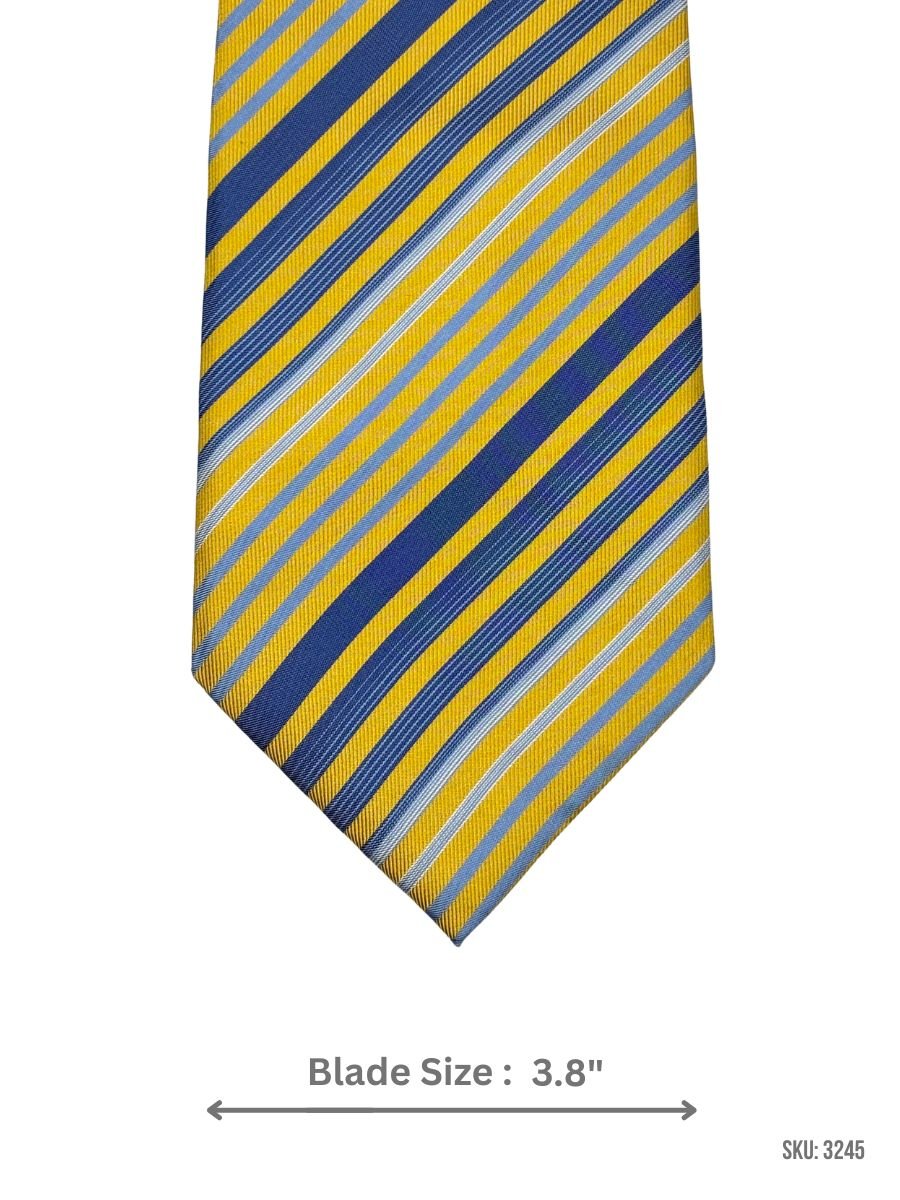 This yellow tie features strong navy blue diagonal bands balanced with light gray striping for crisp contrast. Perfect for weddings, business wear, and sharp suit combinations.