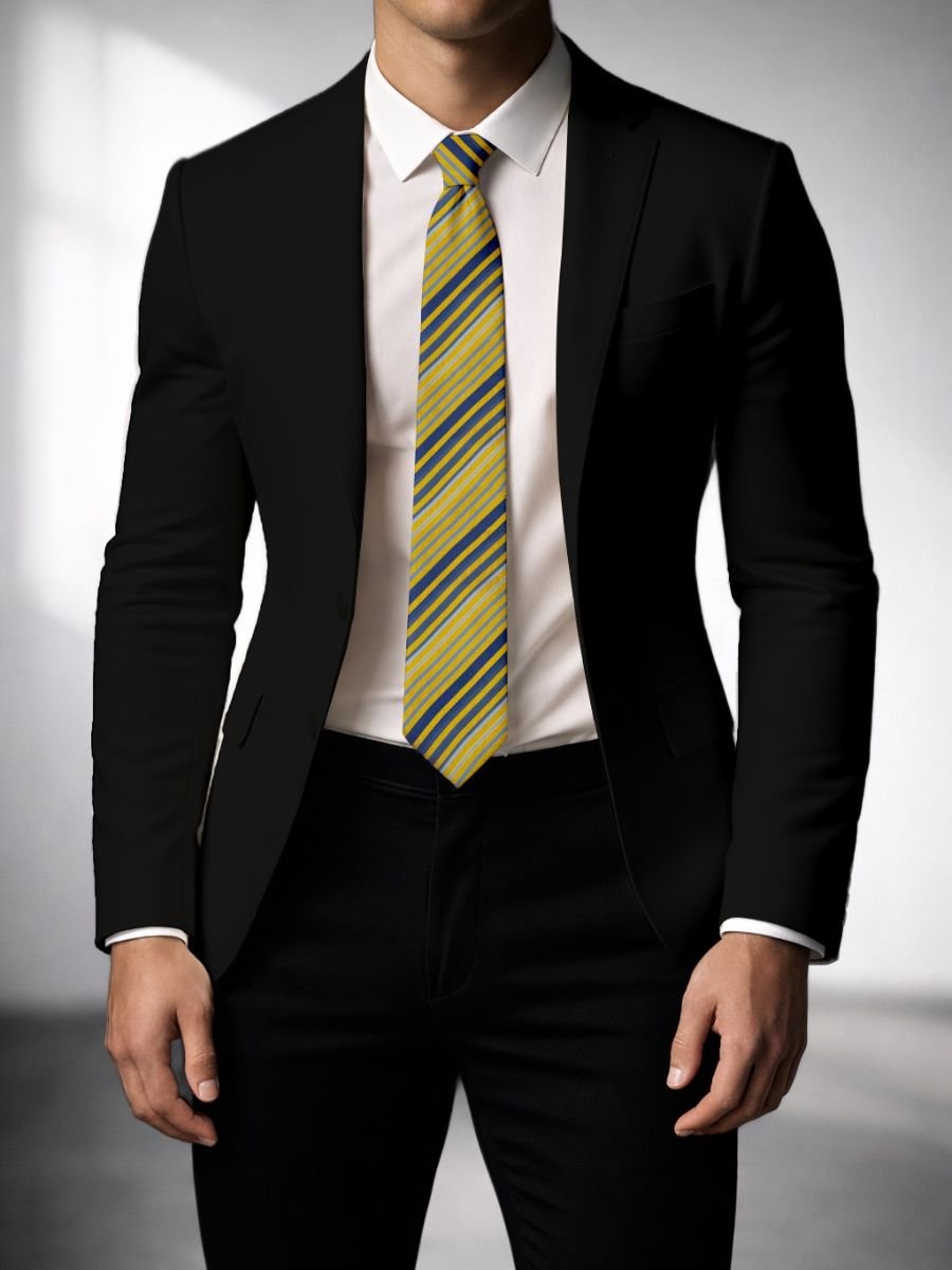 yellow tie with navy blue and light gray diagonal stripes for a bold, classic statement.